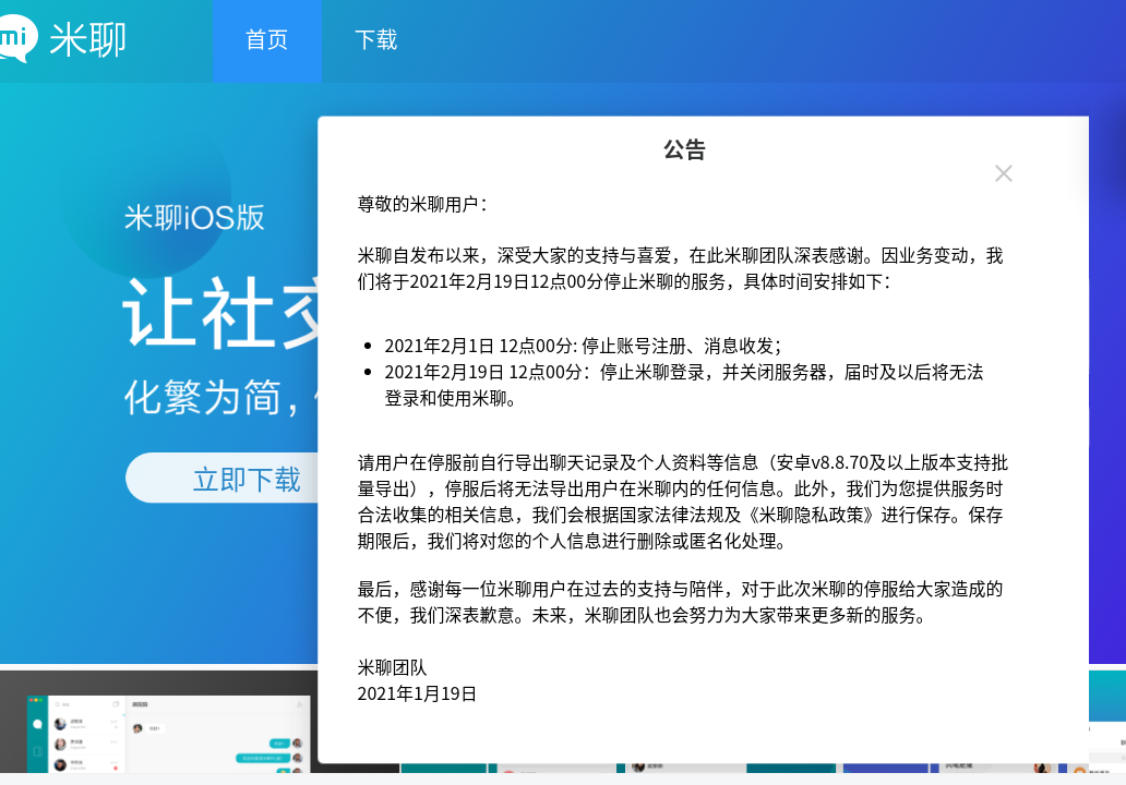 米聊自发布以来,深受大家的支持与喜爱,在此米聊团队深表感谢。因业务变动,我们将于2021年2月19日12点00分停止米聊的服务,具体时间安排如下: