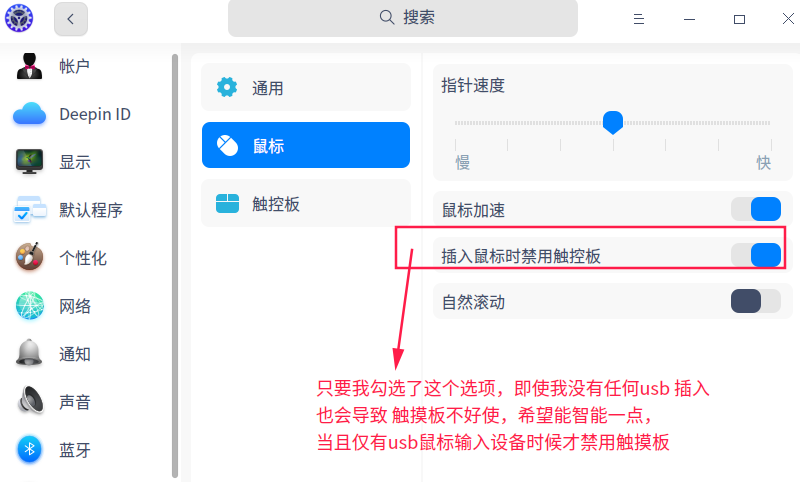 1.当我在 控制中心 的 鼠标面板里 选择了 当鼠标存在时候 禁用触摸板,