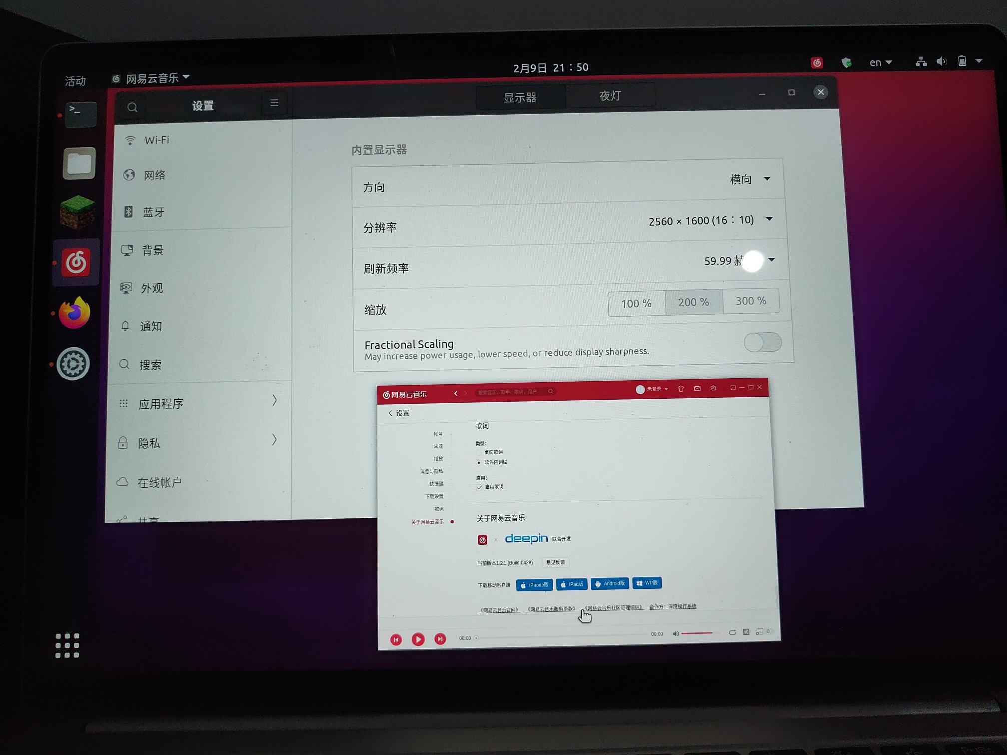 网易云音乐无法跟随系统设置进行缩放,目前系统分辨率为2560×1600,缩放200%,使用版本为Ubuntu版