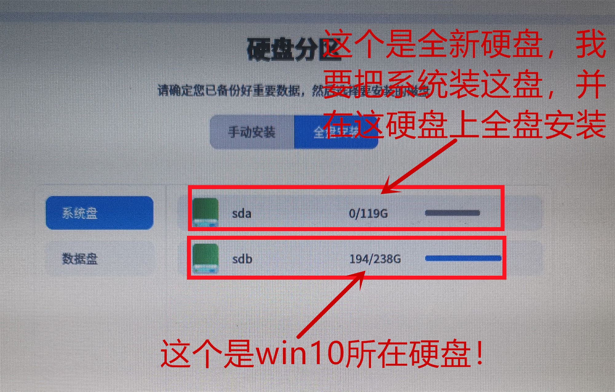 全盘安装的“全盘”是指“你选定的一整个硬盘”,即:只需要按照你的第一张图里那样选中sda就行了,sda指的就是一整块120G的新硬盘,sdb指的是240G的旧硬盘。