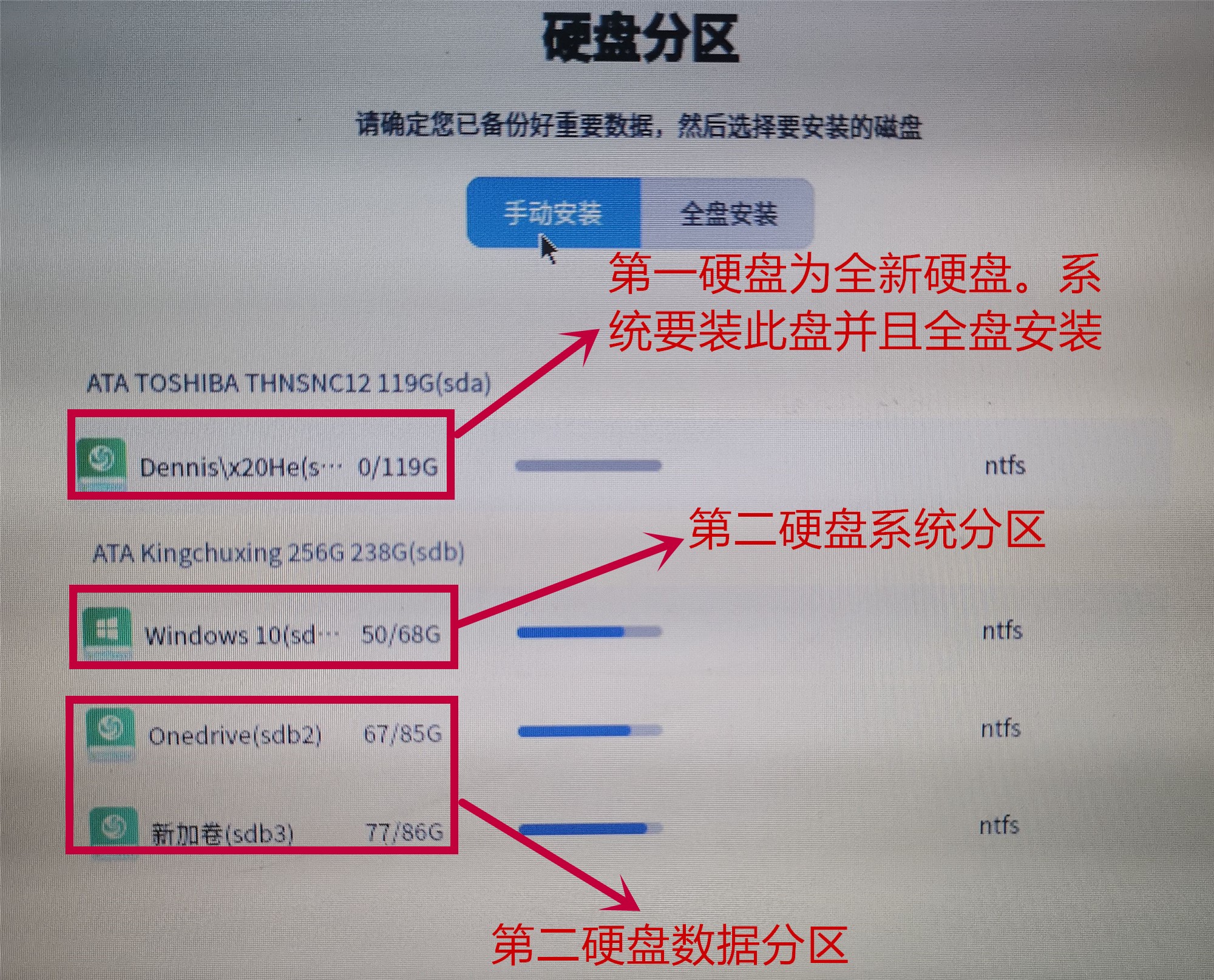 或者我在windows下先把sda这块新硬盘分为两个区,安装时,其中一个分区设为系统盘、另一个分区设为数据盘?