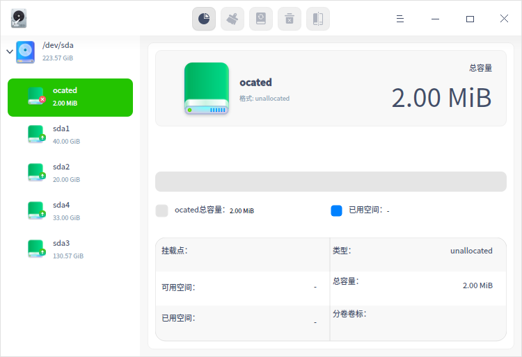 8. unallocated 未分配空间的原因也可能是安装前划分的空闲分区[装deepin]位于逻辑磁盘,安装后空闲分区变为主分区,之间划分流出的空闲空间:(又试了安装一次,磁盘开头的Ocated可能是是win10的系统保留分区,空闲分区[装deepin]划分为主分区的情况下没有出现磁盘中间的Ocated)
