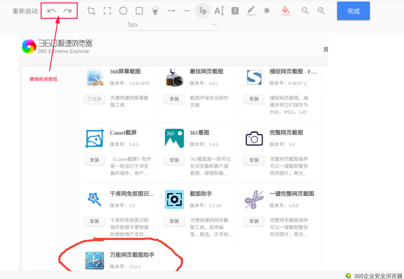 如图所示:这是网页浏览器插件中的截图工具示图,Windows下的截图工具基本都有撤销前进功能键。