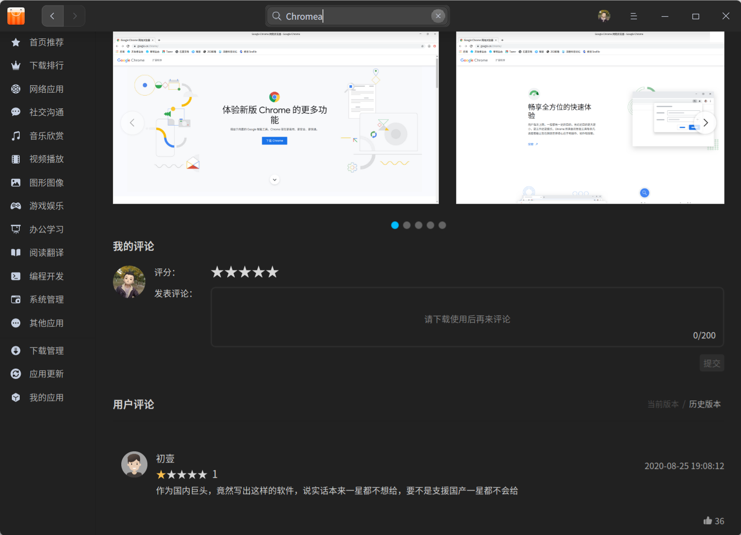 下图是我在QQ(linux)软件详情搜索chrome,会直接进入chrome详情,但下方的软件评论还是QQ(linux)的