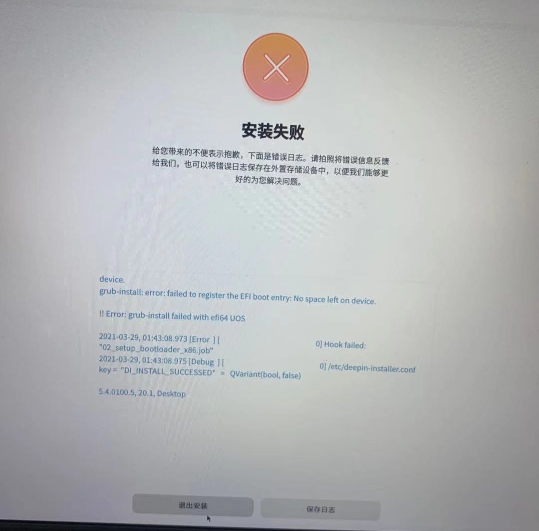 移动硬盘安装deepin 第一使用全盘安装 安装成功 但是启动电脑无法进入系统 于是重新安装 使用手动安装 失败 报错为no space left on device