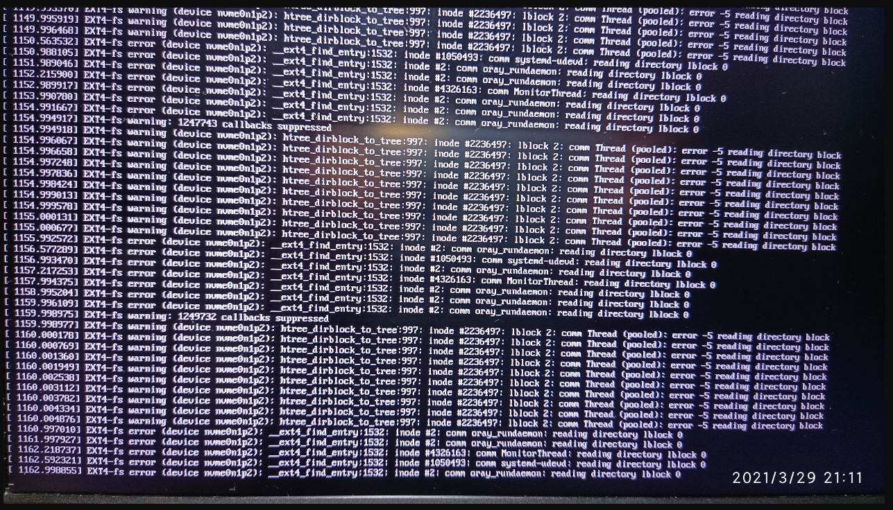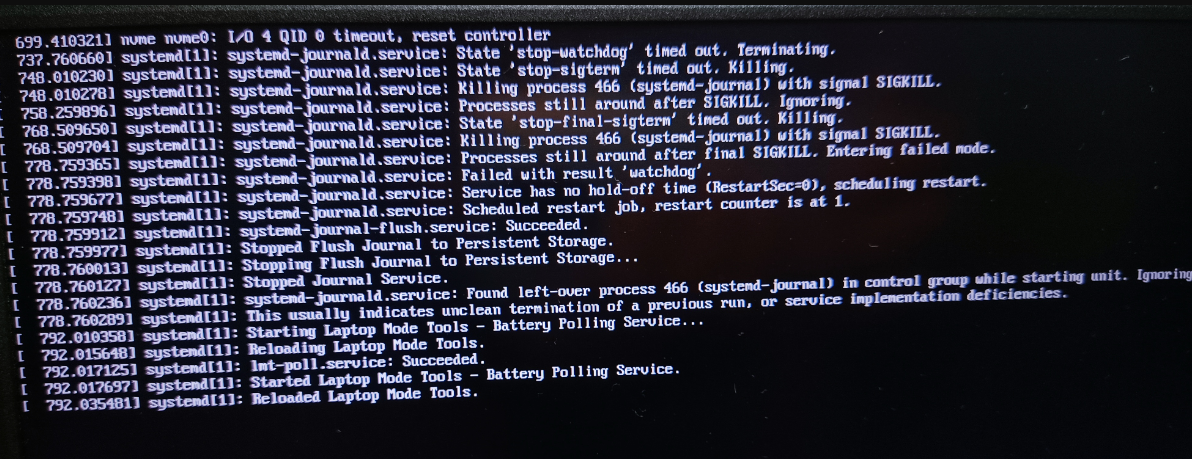 我之前使用单Deepin系统(128G SATA协议固态)半年没啥问题的,前不久,我换了一个NVME协议的固态,重新安装Deepin+win10 双系统后(UOS+win10 也是一样的情况,deepin 出现这样的情况我就换UOS了,后面的图片都是在使用UOS的时候拍的),发现系统频繁卡死,一天3,4次吧,卡死后鼠标能动,但是不能做任何操作,按Ctrl + Alt + F2 进入终端,没有提示登录,而是提示其他的,如下图:
