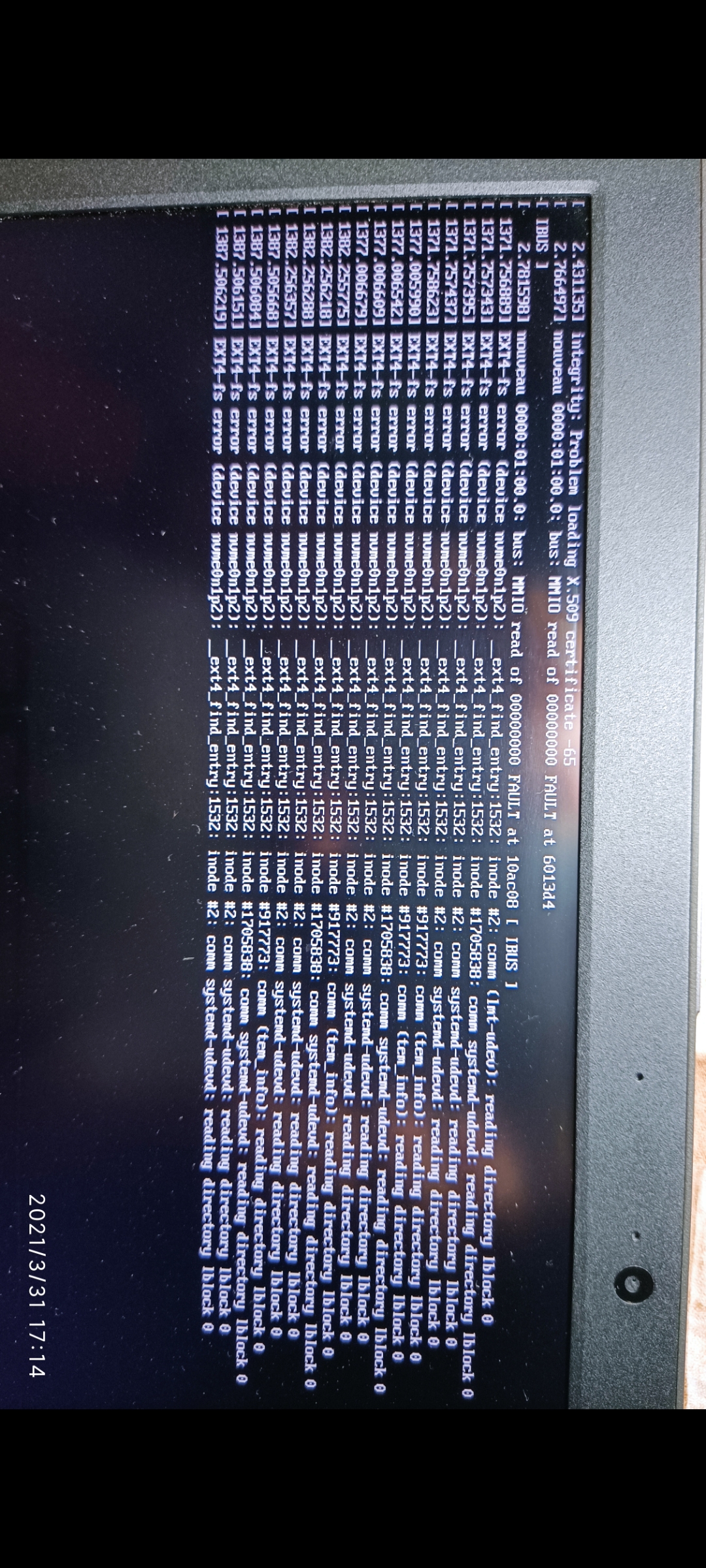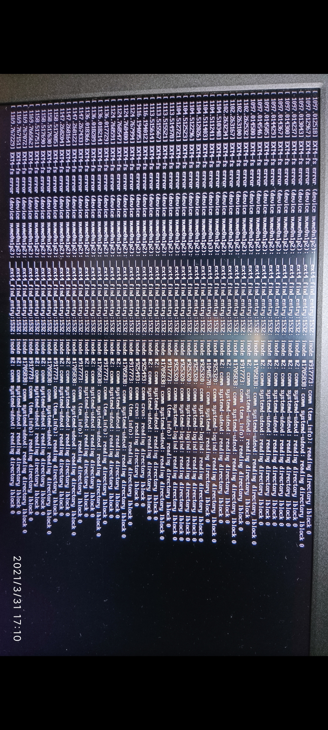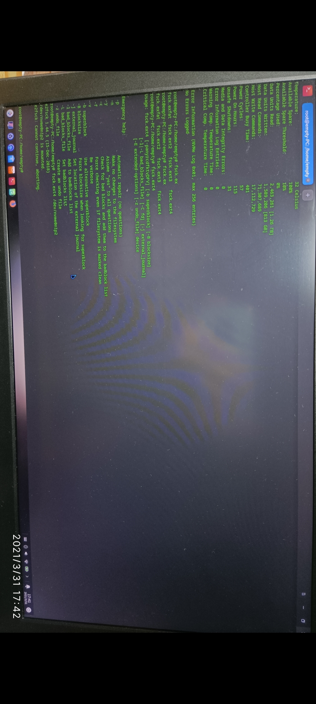 很不幸,刚卸载完Chrome和搜狗输入法重启后,上网找了一个命令:smartctl -x ,命令输入后显示没有错误日志, 然后又试了命令fsck.ext4命令,发现不行,要卸载分区,我又用手机继续找方法,过了一会,准备关闭终端窗口,发现又卡死了。下面是图片: