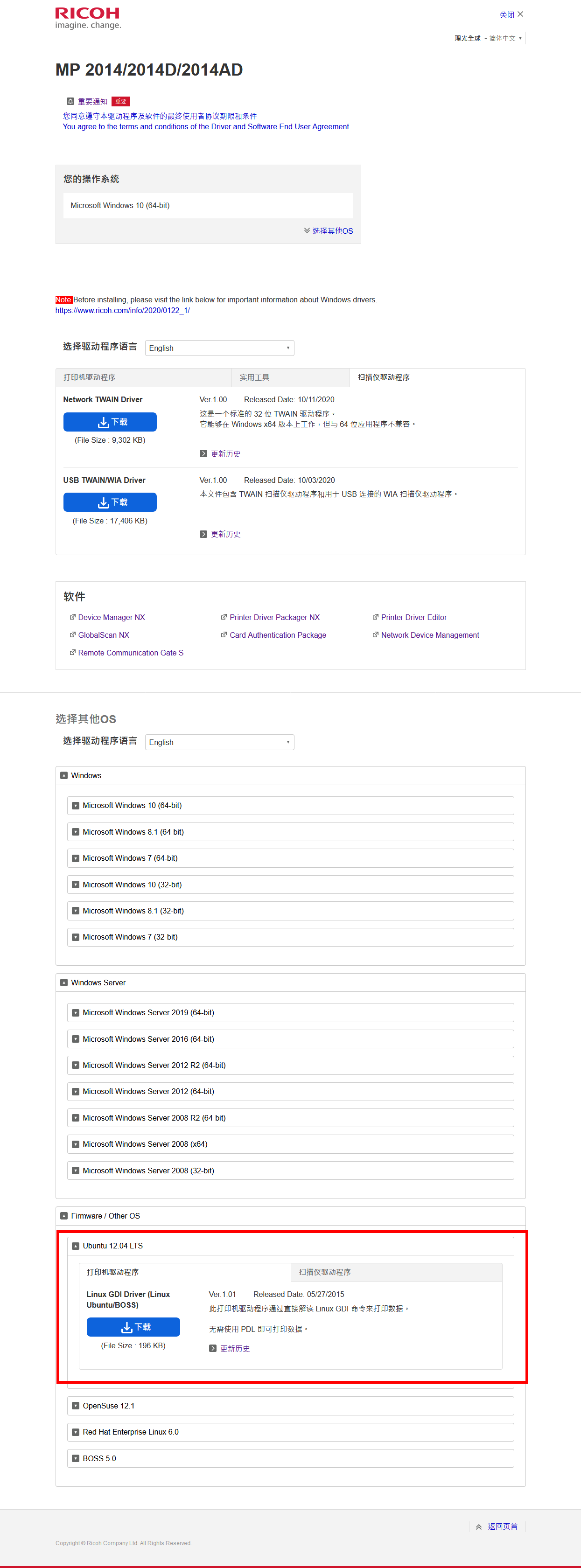 理光全球可以找到Ubuntu的驱动,我想应该是一样的。可以试试!