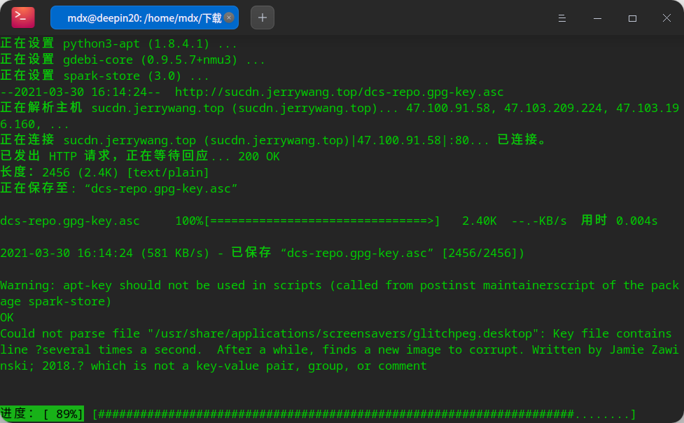 今天在 deepin 20.1 上安装下载的星火商店 3.0 时,安装过程中卡在Could not parse file "/usr/share/applications/screensavers/glitchpeg.desktop" 处,删除了这个文件里面 Comment 后面文字其中的换行符解决。另,安装星火商店的末尾会因执行 update-mime-database 命令顿住好几分钟。另外,电脑的 nvidia 显卡不能是开源驱动 nouveau,必须装上私有驱动 nvidia ,否则星火商店会闪退。如我的 GeForce 9600 GT 用 sudo apt install nvidia-legacy-340xx-driver 安装了 non-free 的驱动才行。