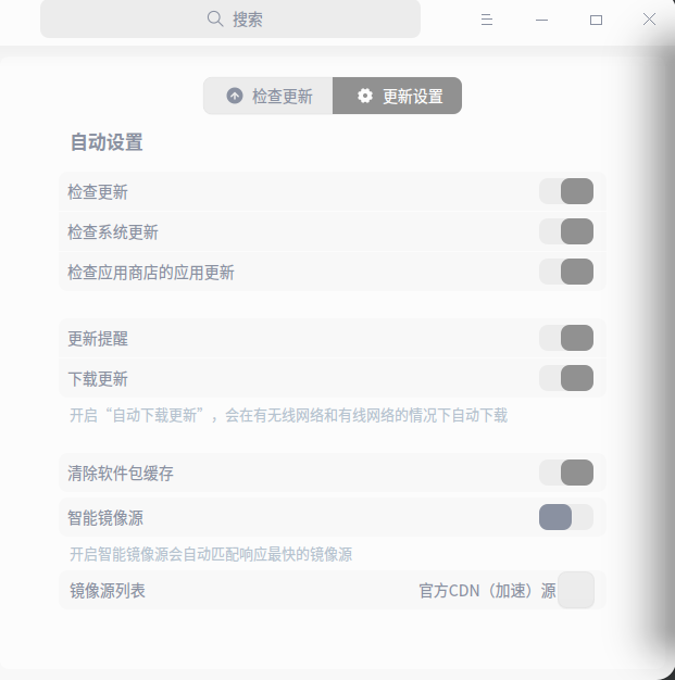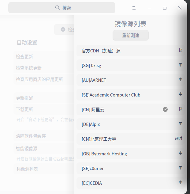 已经尝试在更新设置中关闭智能镜像源并选择速度较快的节点,
