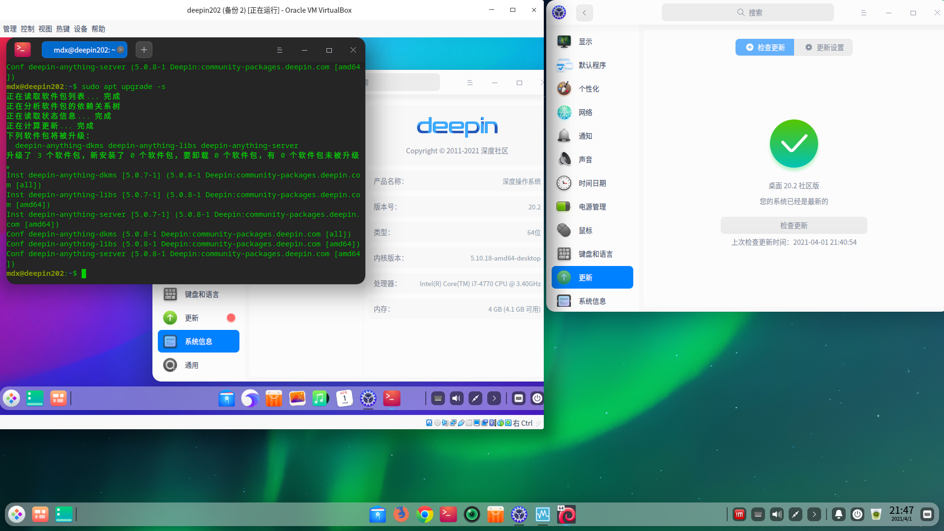晚上再运行 VirtualBox 里的已经全新升级完成的20.2,发现又有更新,如下图里的,更新后还是打开控制中心正常。