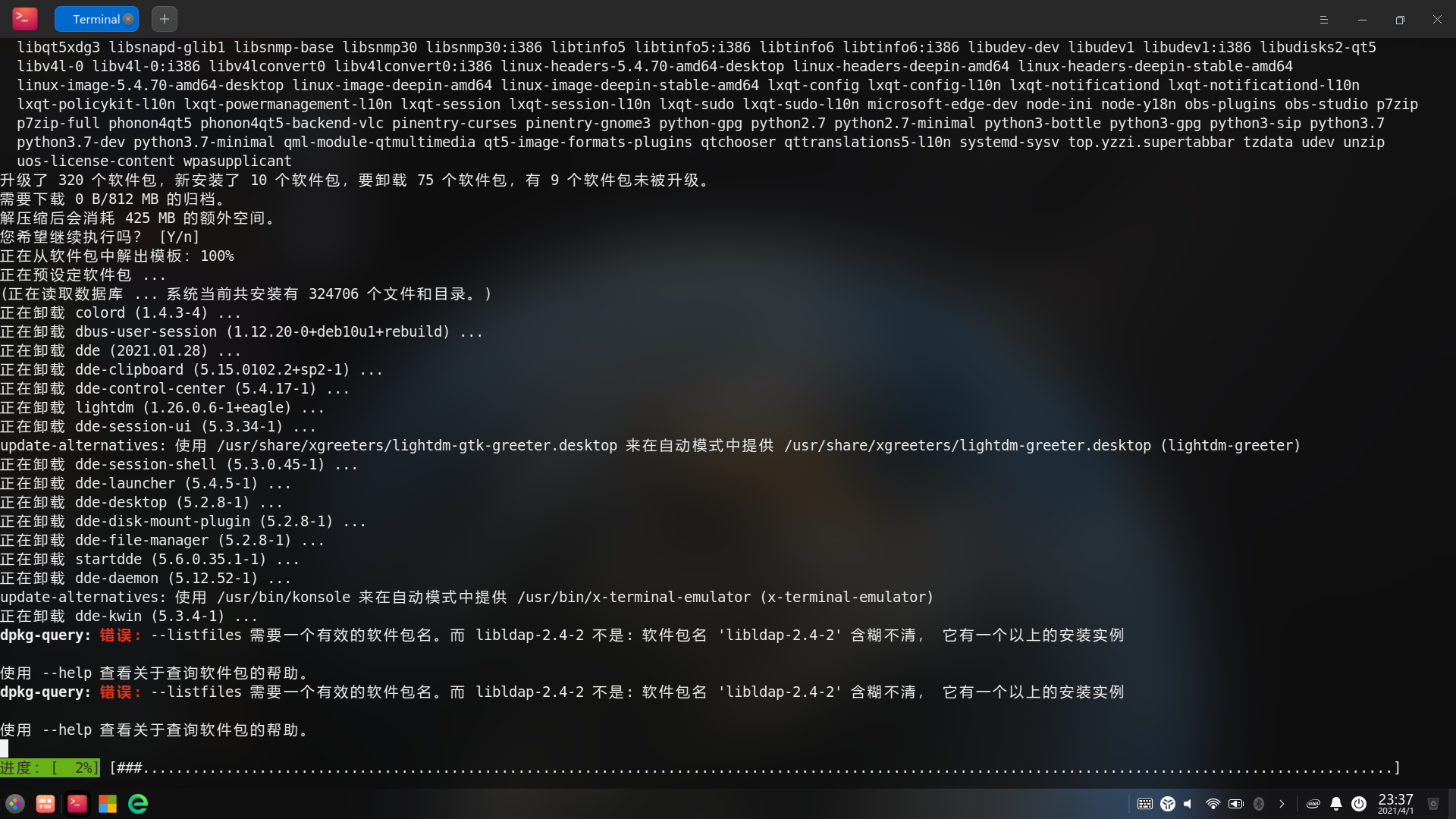 你发现没有,dde被卸载了,即便升级成功,你的系统也基本废了