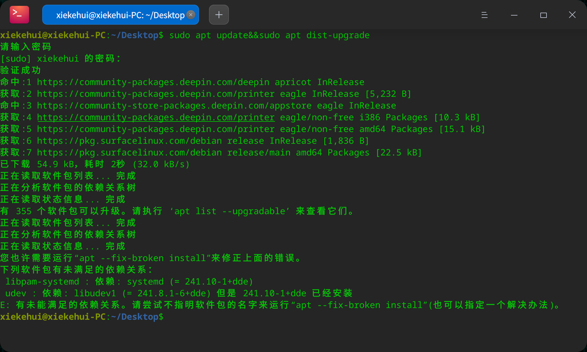 自从升级20.2失败后,就一直提示依赖错误,终端也无法更新,咋整
