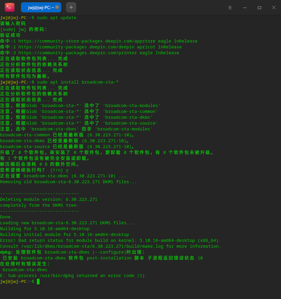 源里面的 broadcom-sta-* 这几个没更新,5.10 以上内核用不了。