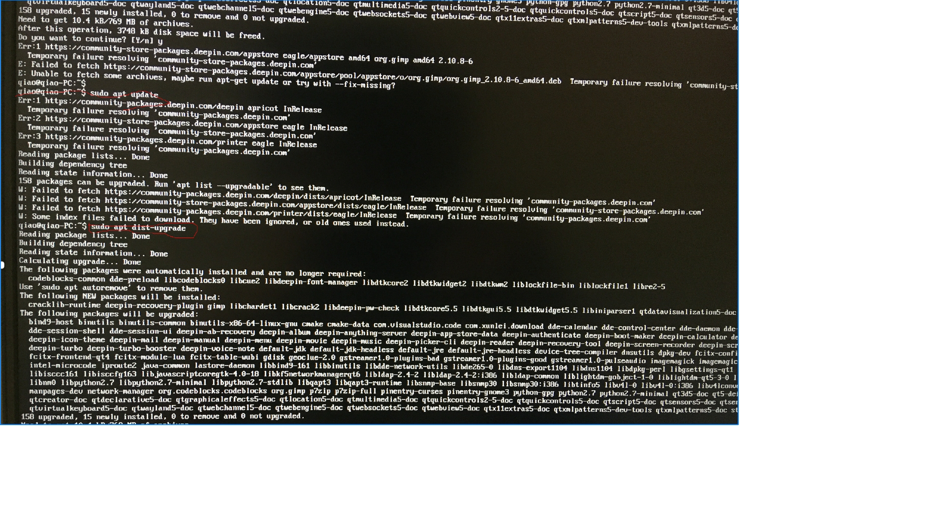 今天来公司找了个usb转网卡,连上有线网络。然后又apt update没再报错,sudo apt dist-upgrade出现这个错误(我记得没错的话,之前也是报这个)