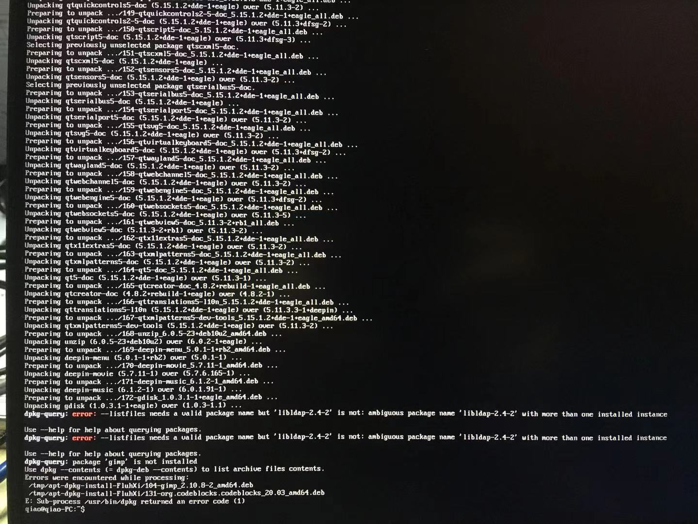 两台笔记本,acer S7-392和小新air14 2020锐龙版,升级20.2都提示“依赖错误,安装失败”,但还能正常进入系统。按照论坛教程S7升级成功20.2,于是又折腾air14,结果air14现在不能进入UI了,ctrl+alt+f2可以进入终端,apt update和apt dist-upgrade提示这个错误。希望大家帮忙解决下,air14是主力机,去年10月装完就一直当ubuntu开发在用,平时主要就是wps,pdf,chrome,文本编辑器,交叉编译器,QT,微信,慢慢的项目工作文档代码基本都在这个电脑里了。实在不行就只能先把文件备份出来了,要不然后天上班真的就死翘翘了~~~~