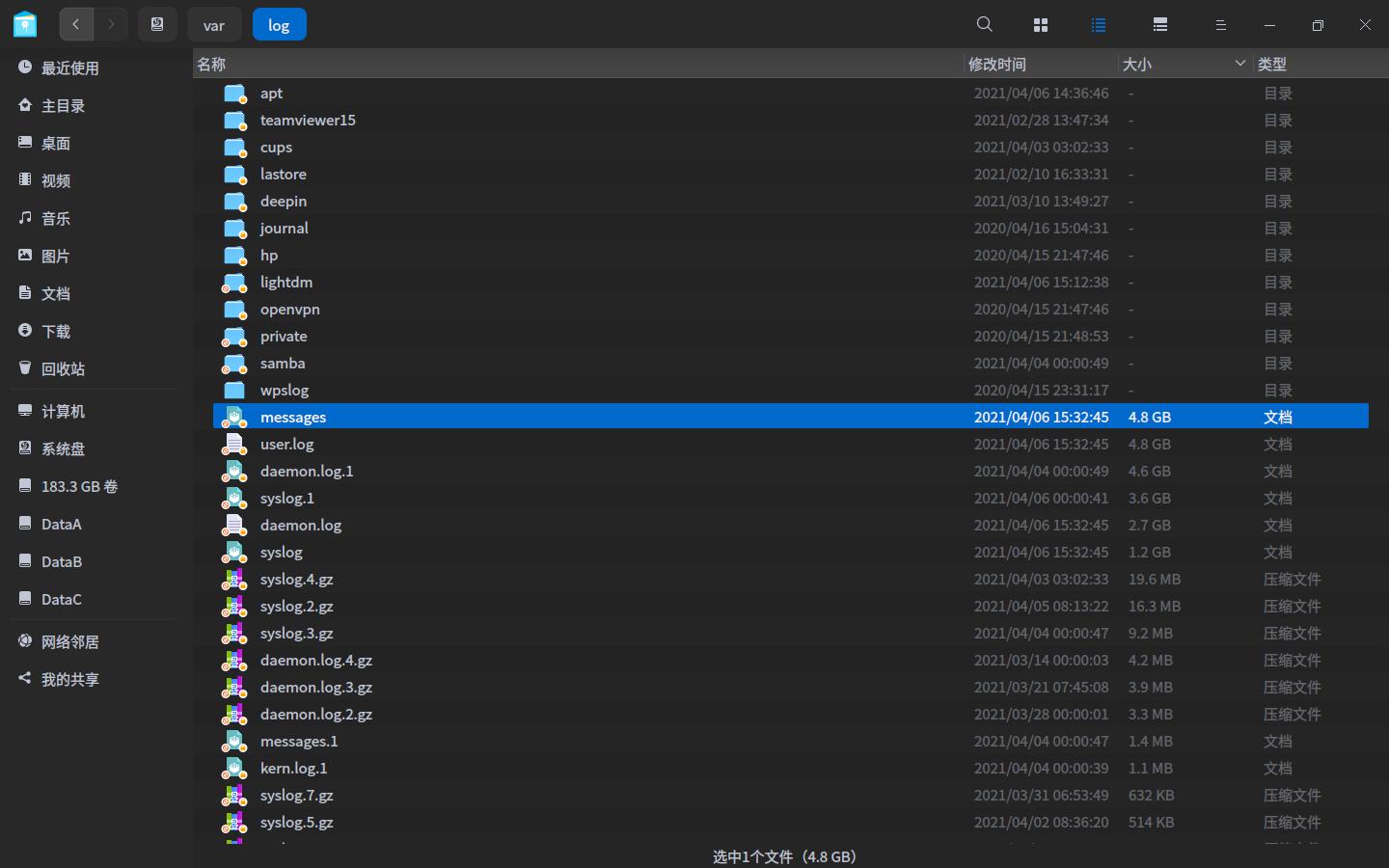 终于知道是/var/log占用了我的系统盘,果断清空大的日志文件。