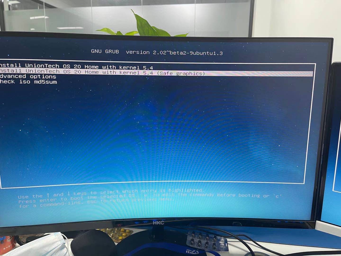 然后选择Install UnionTech os 20 Home with kernel 5.4(Safe graphics)时所有界面都是正常的。