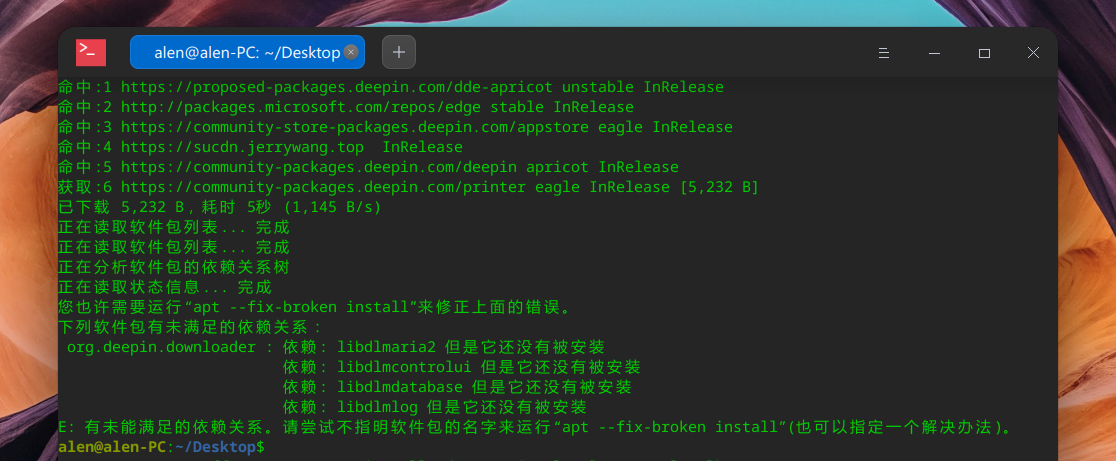 E: 有未能满足的依赖关系。请尝试不指明软件包的名字来运行“apt --fix-broken install”(也可以指定一个解决办法)。
