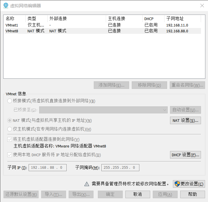 windows下有个网络适配器,里面有vmnet8这个,我想修改的是这个。