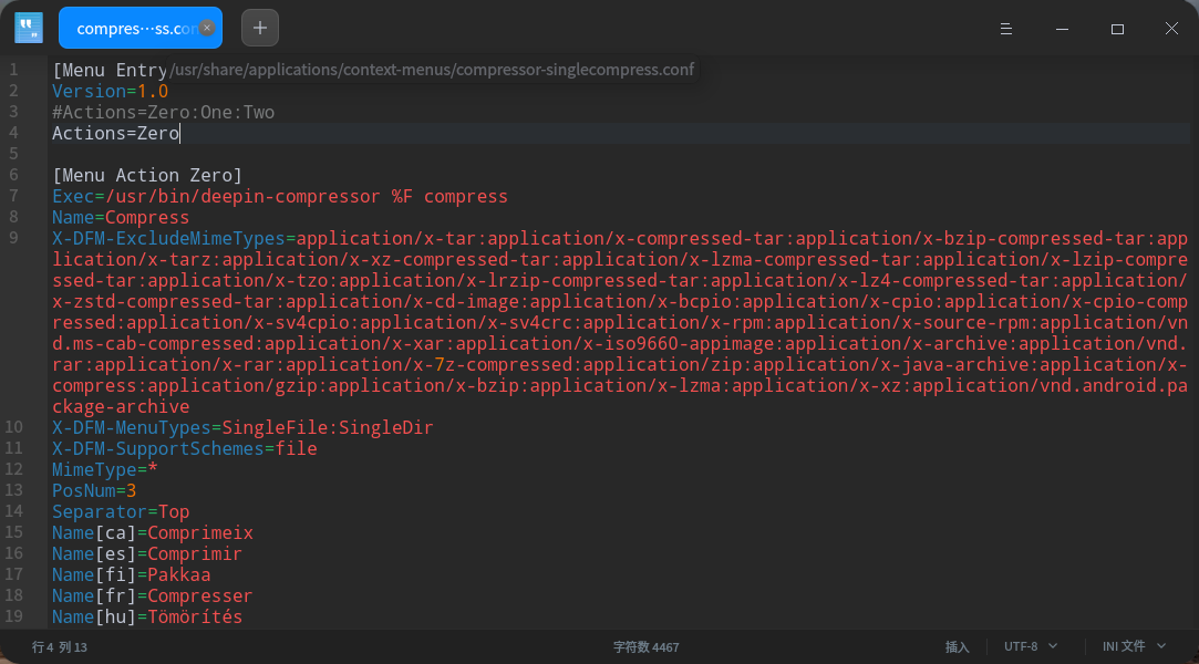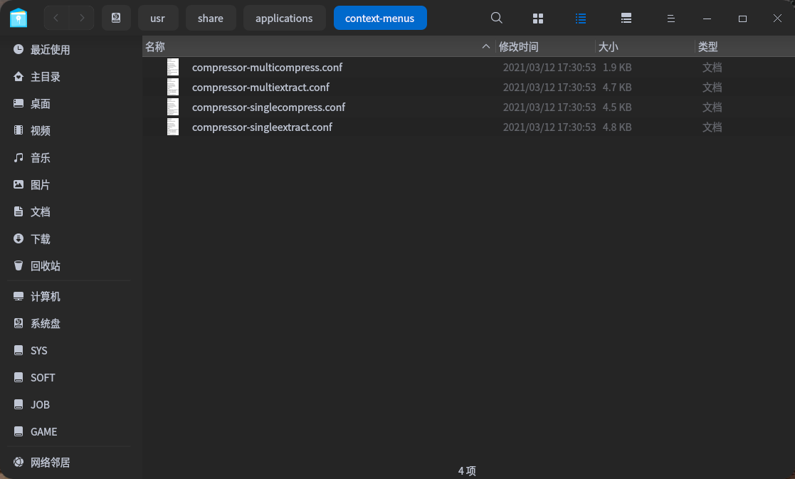 问了一下,在这个位置:/usr/share/applications/context-menus