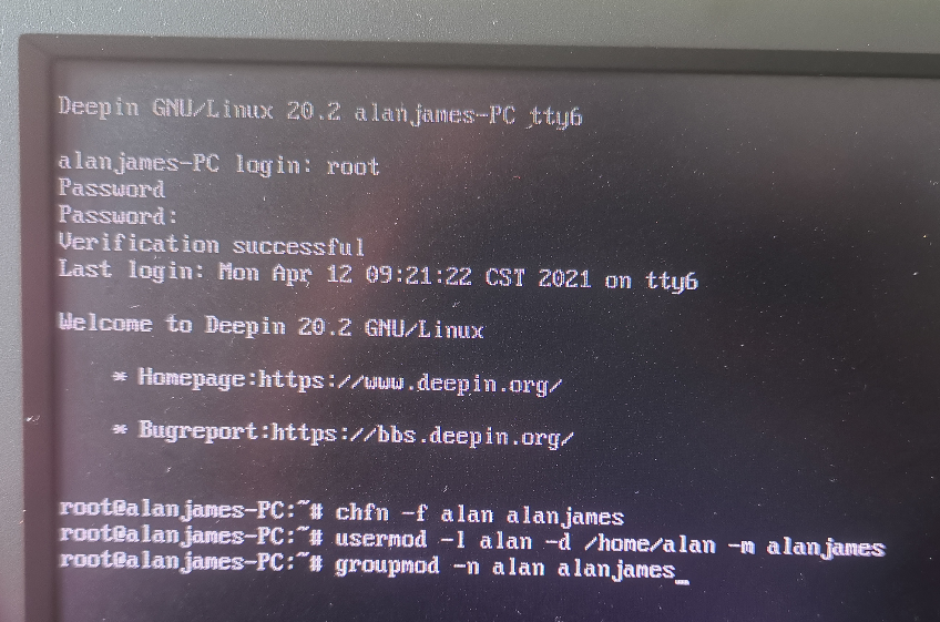 Ctrl+Alt+F6)以root账户登陆。如果没有root账户密码请先执行设定root密码(sudo passwd)。修改用户名: