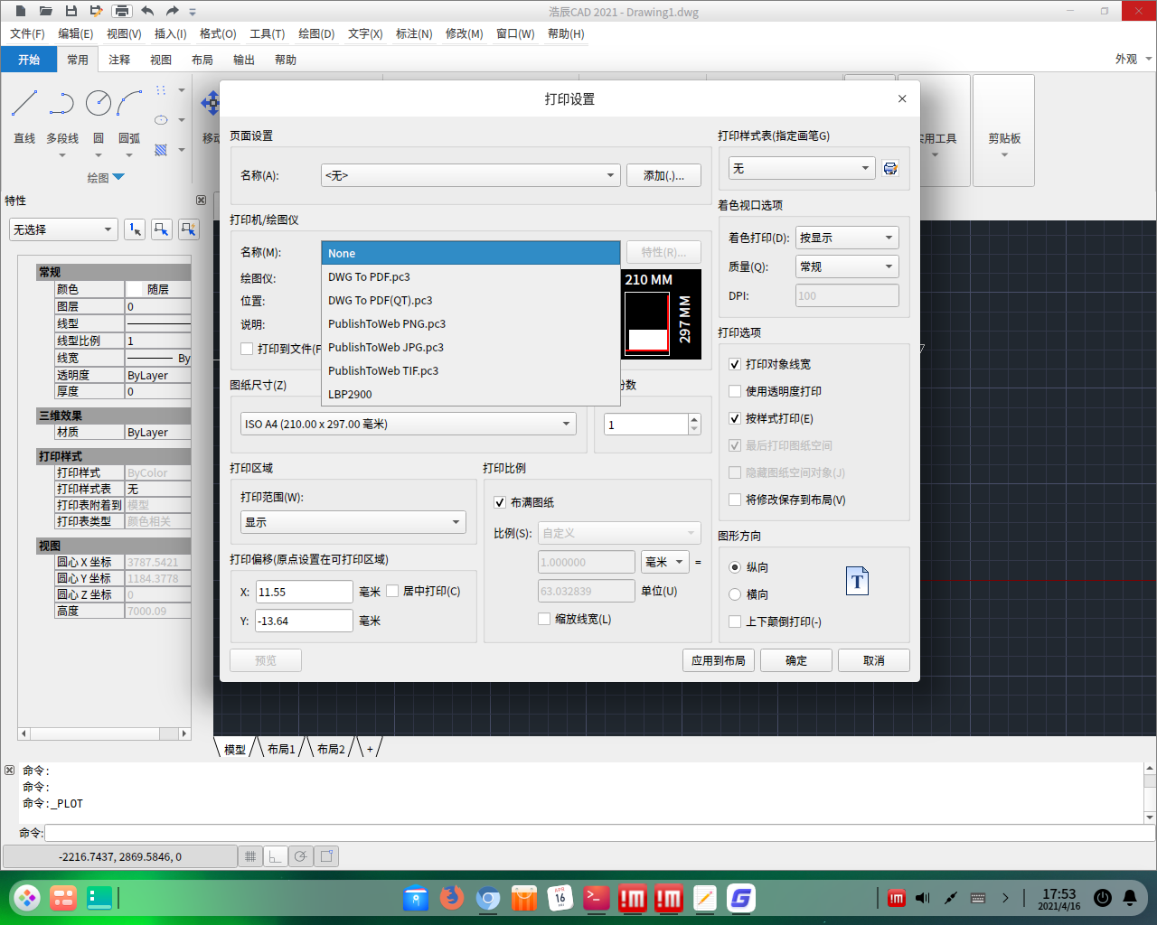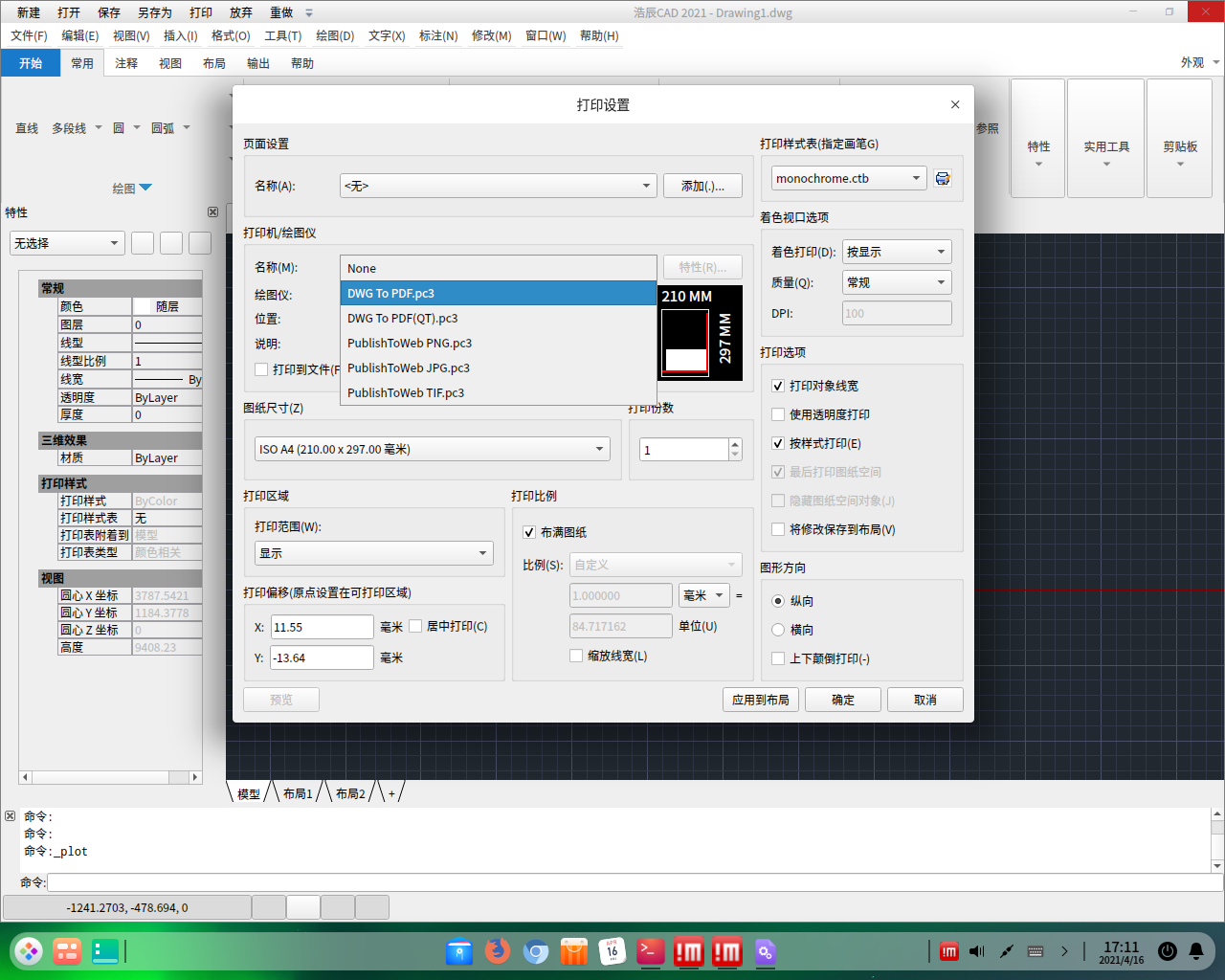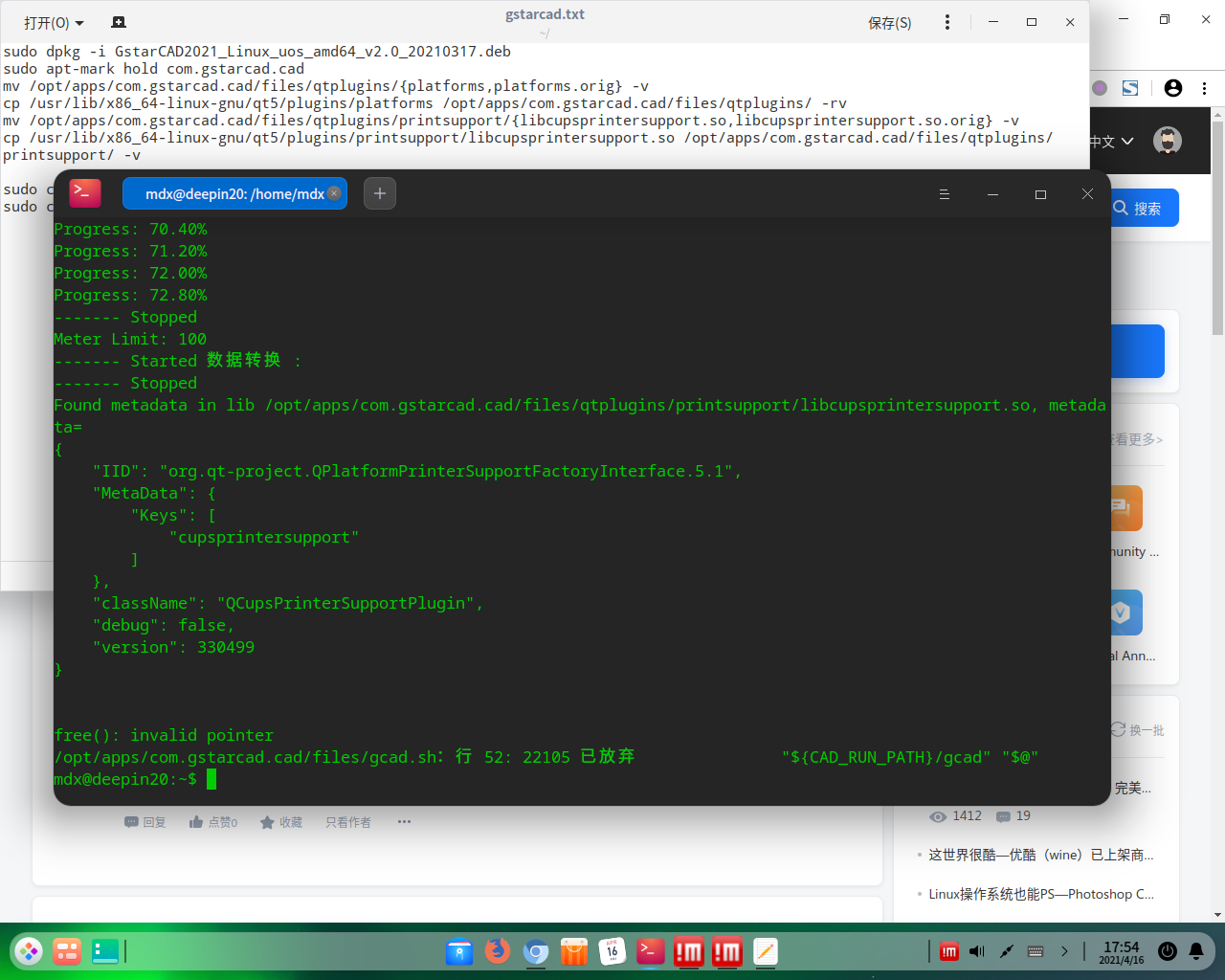 但是又出现在 Deepin 20.1 下没有出现的新问题,无法用打印机打印图纸,在打印界面一点击物理打印机浩辰CAD就闪退,打印成PDF不会闪退。在命令行“bash /opt/apps/com.gstarcad.cad/files/gcad.sh”启动浩辰CAD闪退后的信息显示为: