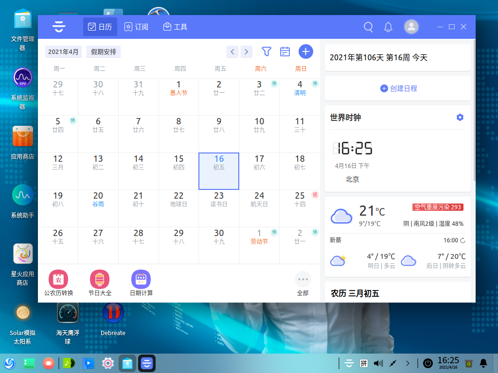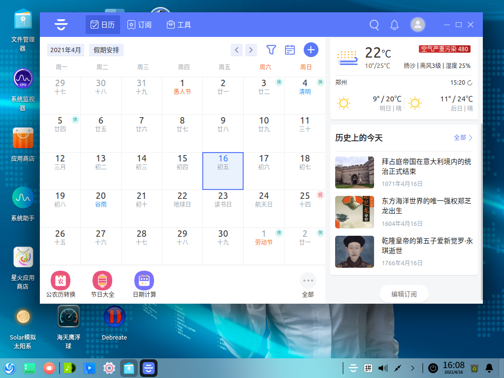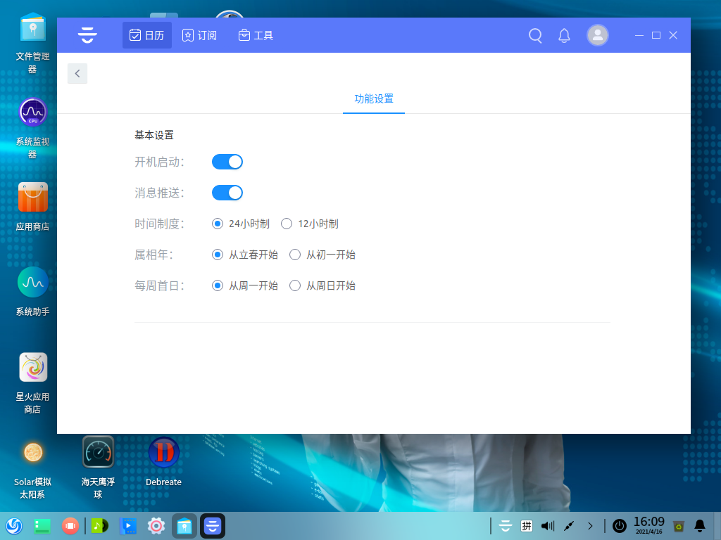 今天无意中,发现一款日历软件,原来是在Windows系统中用的,一直感觉挺好的,今天去官网看了一下,居然支持Linux了,于是在Deepin中测试了一下,还可以,不过没有Windows下的桌面模式,有点遗憾,其他的都挺好的,推荐给有需要的小伙伴。