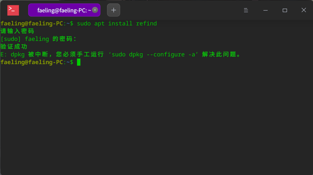 进入 DEEPIN里的终端,运行sudo apt install refind 出现DPKG被中断,运行sudo dpkg --configure -a后卡死。