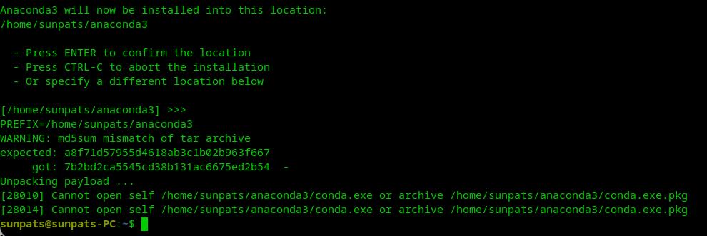 [28014] Cannot open self /home/sunpats/anaconda3/conda.exe or archive /home/sunpats/anaconda3/conda.exe.pkg