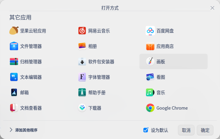 至于Flatpak,目前deepin已经放弃Flatpak兼容了,所以Flatpak产生的.desktop并不会被自动纳入“打开方式”菜单。建议使用原生应用(PS可以用 GIMP)。