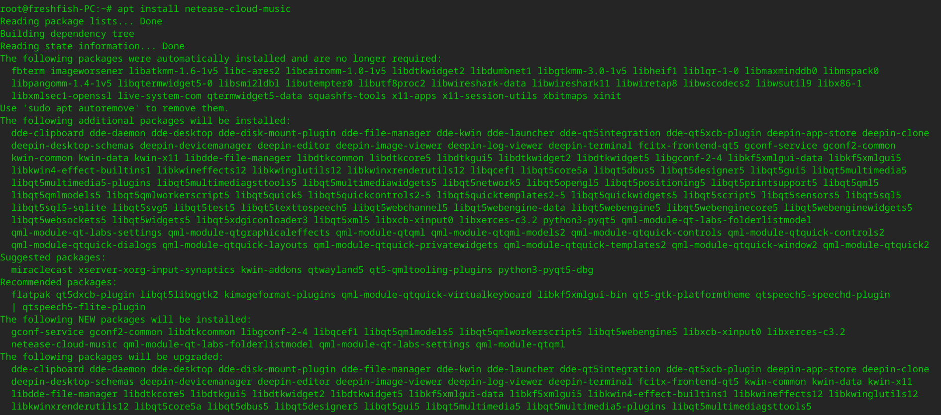 v20.1 尝试安装网易云音乐的自动依赖处理,这明显是把dde 全升级了。。spark store 因为apt默认源没有,就不尝试了,图形化工具,会安装成功。。然后重启黑屏