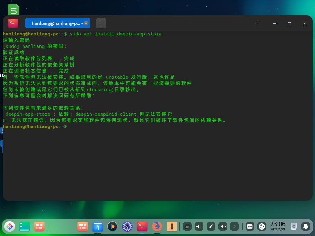 但发现没有应用商店,用命令行安装,结果报错,如下图