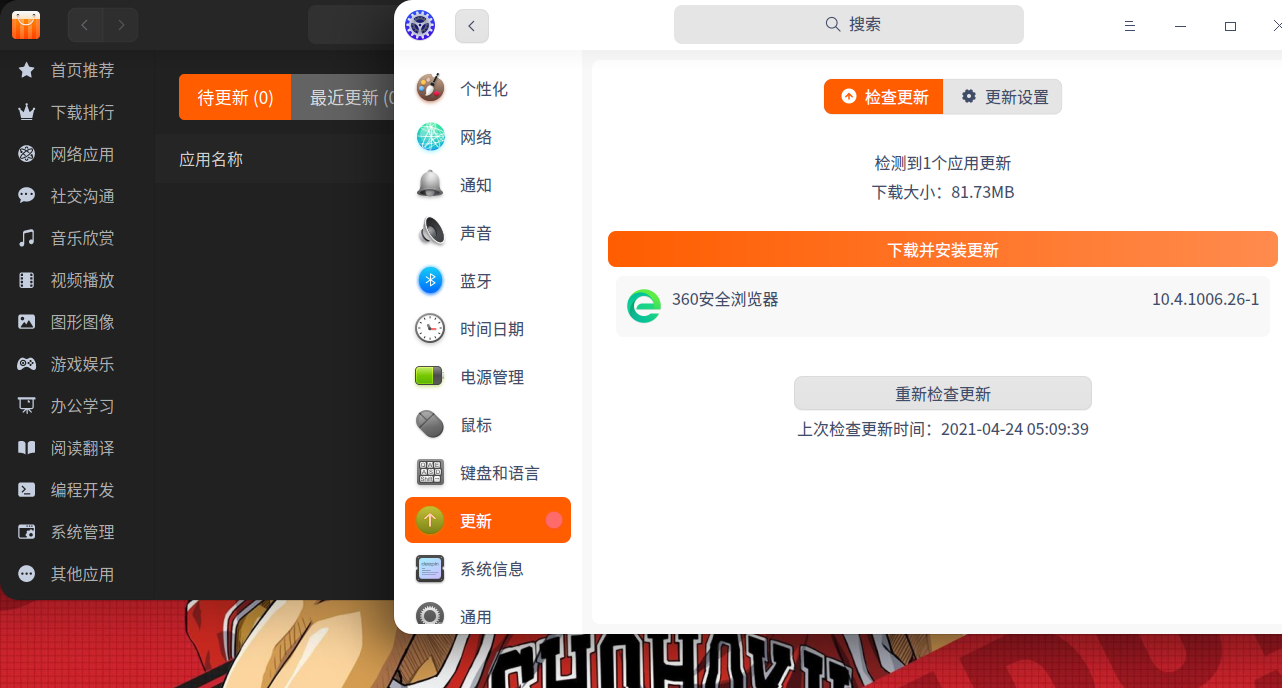 我这边关了控制中心的更新,商店一直都有提示的,下次可以试试sudo apt update看看