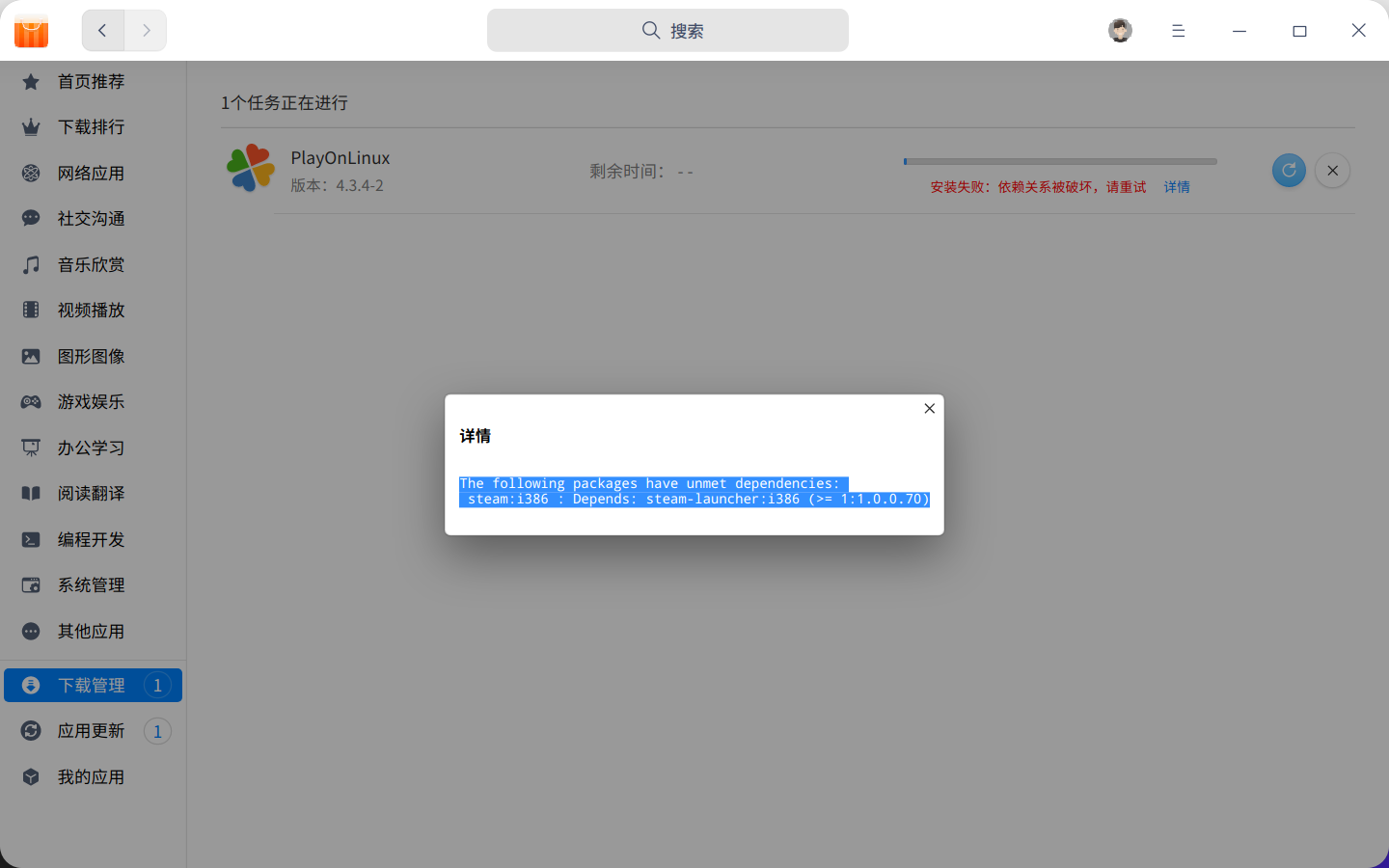 安装32位支持库出错后系统提示依赖错误,Steam安装卡住