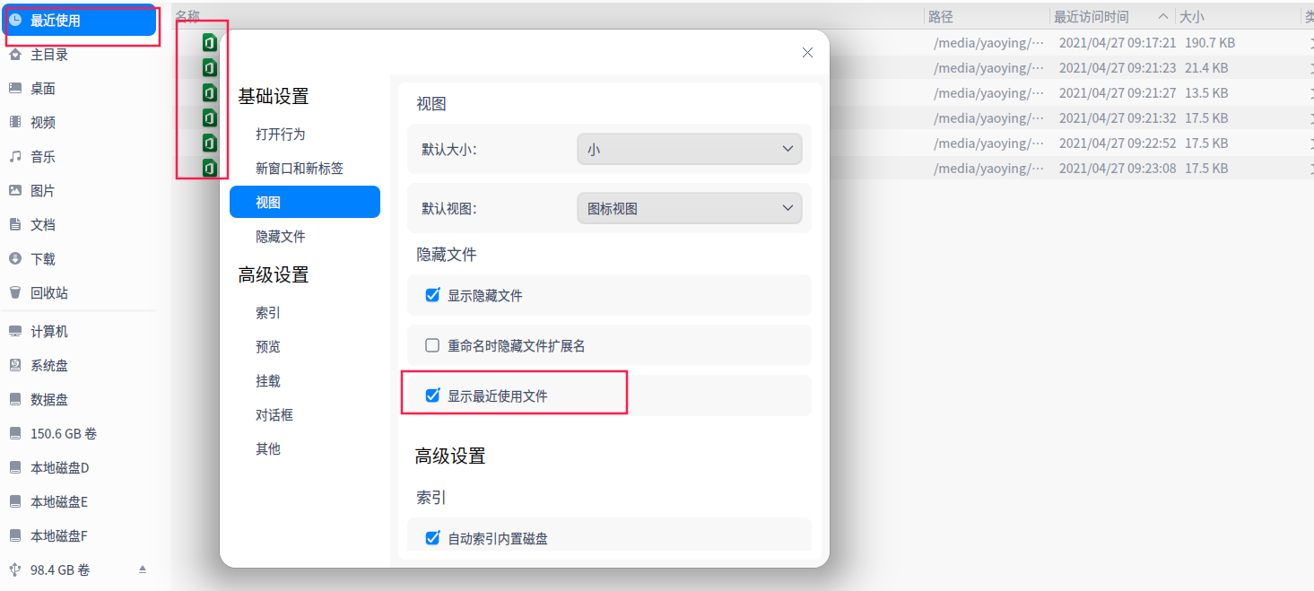 打开设置,关闭最近使用,他只是不会显示,但是仍然记录最近使用,当你在关闭的时候,访问的记录,他依旧会记录,在次打开,你会发现关闭期间的所有访问记录依旧被记录,这个有可能会侵犯隐私