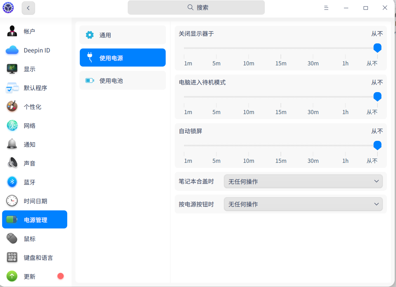 1. 在“电源管理”中将“使用电源-笔记本盒盖时”设定为“无任何操作”。