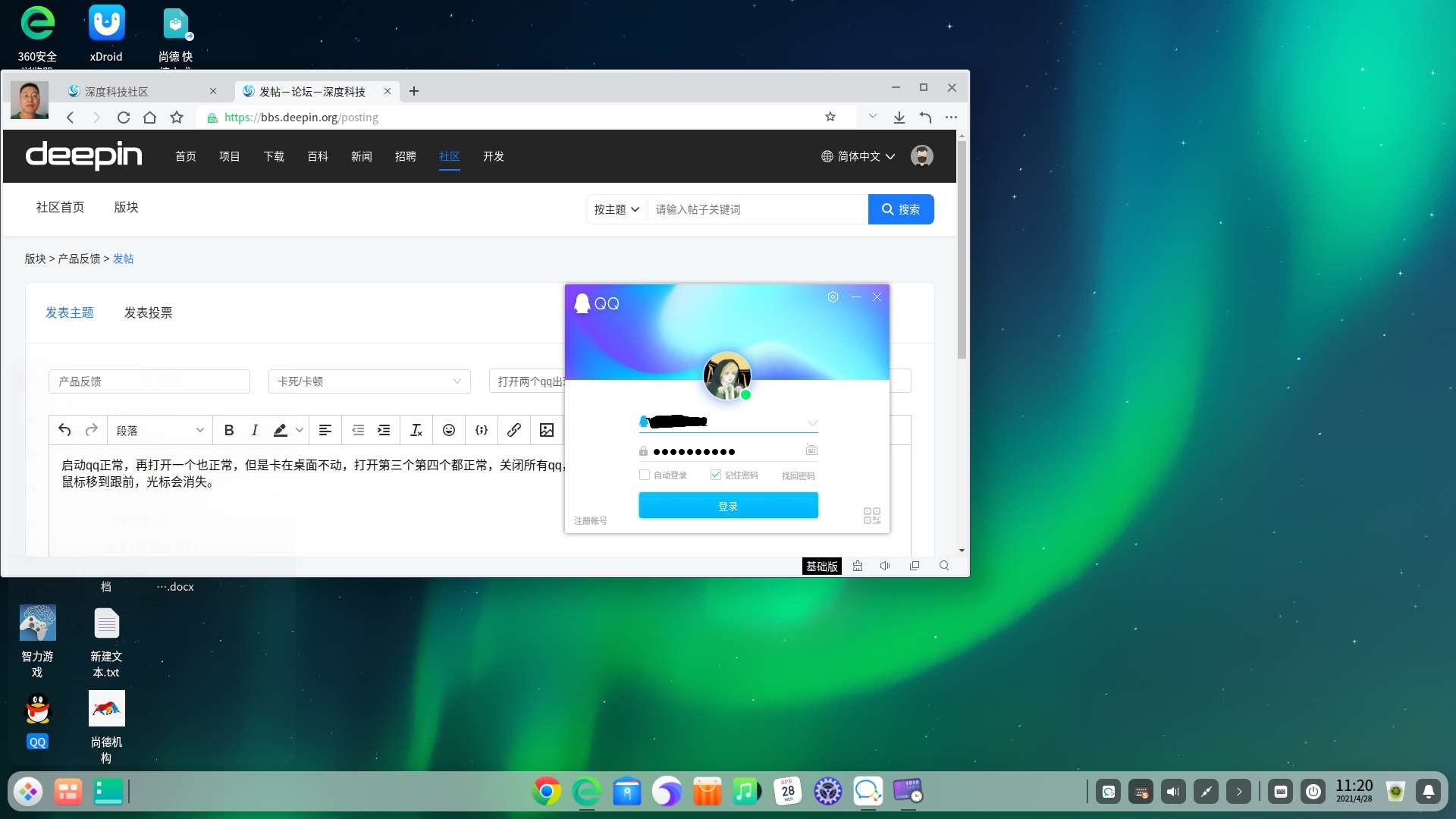 我也上报了BUG。 [使用交流] Wine QQ 启动后有时不能取得窗口焦点且固定在最前面 https://bbs.deepin.org/zh/post/219420