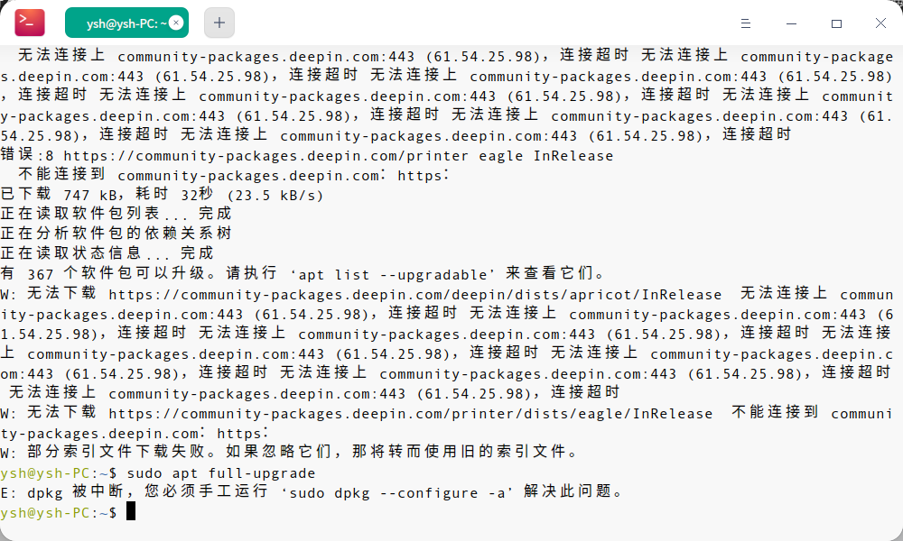 先 sudo dpkg --configure -a 看看。不过升级就再等等吧,看起来 deepin 的服务器有问题?