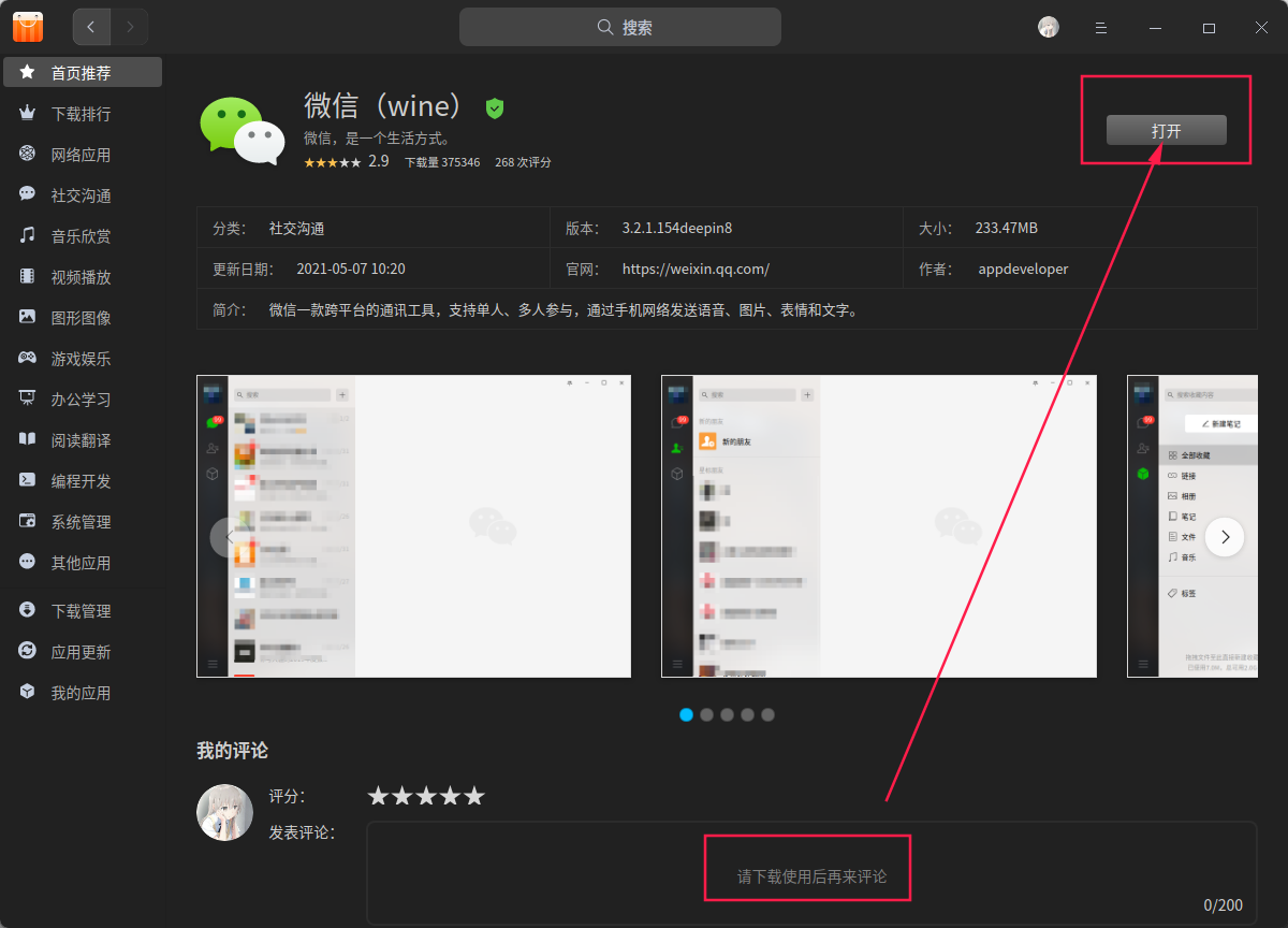 2、应用商店显示已下载应用,评论时仍提示需先下载才能评论。我是通过sudo aptitude update && sudo aptitude full-upgrade命令升级的微信。