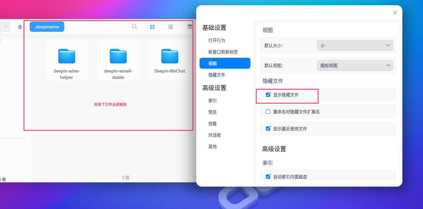 碰运气的,如下图,打开显示隐藏文件,home/用户名/.deepinwine 目录下 的文件全部删除,
