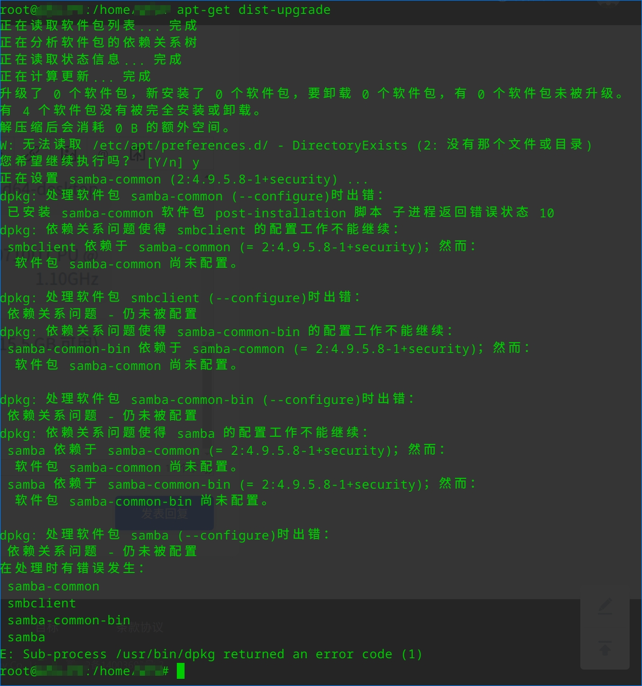 已安装 samba-common 软件包 post-installation 脚本 子进程返回错误状态 10