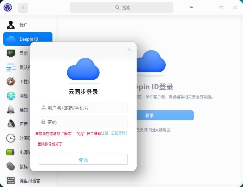 要是能在“设置”-----“Deepin ID”帐号登陆那里增加“微.信”“Q.Q”扫二维码登陆就好了。