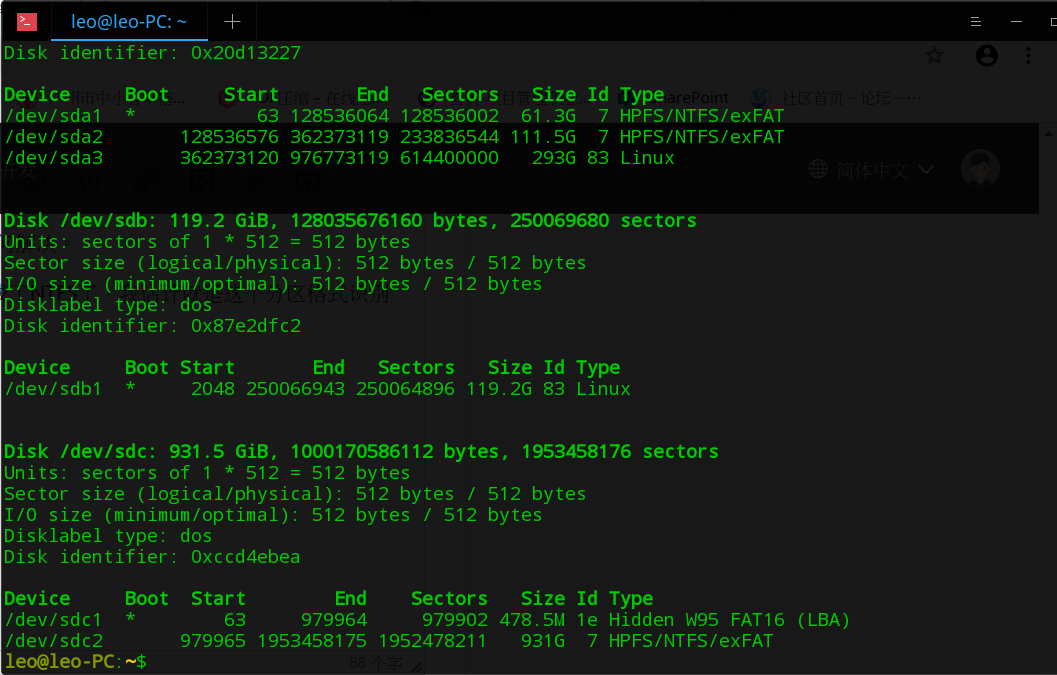 移动硬盘我分的是EXT4分区,但是现在用 fdisk -l 看到的,确实识别成了NTFS了,我估计就是这个分区格式识别错误导致不能加载,接下来如何修复呢? 下面截图最后一个分区,识别错了