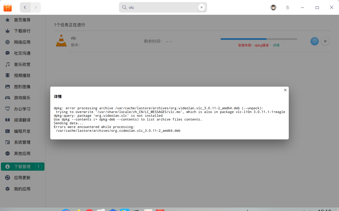 1、在商店安装vlc,出现dpkg问题,请问该怎么解决