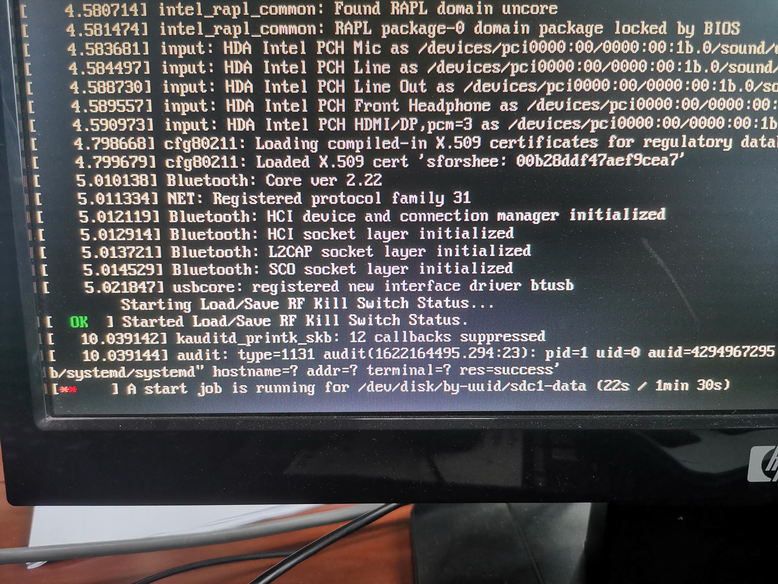 我把卷名改为了sdc1-data,在fstab中,UUID写成了卷名sdc1-data,启动就出现下图的问题