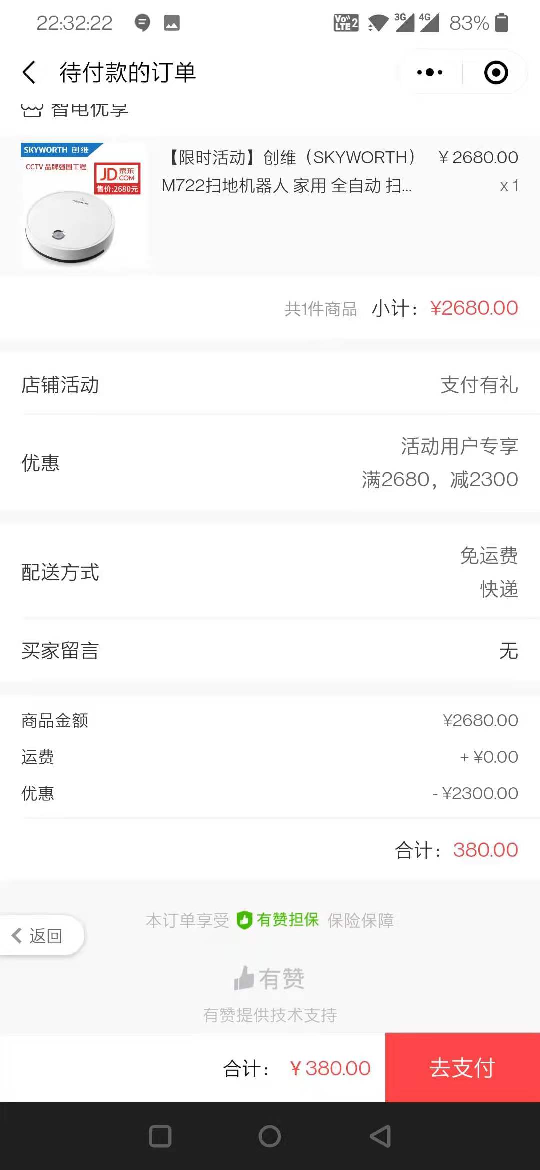 今天看到官方发的调查问卷活动,填完之后,页面下方有个提示,说有一个精美礼品,然后我点击去了,抽奖,转盘转了之后说我中了2300多元的扫地机器人(创维skyworth)m722扫地机器人)的券,此时我看提示的有赞的地址。难道官方和有赞有合作?