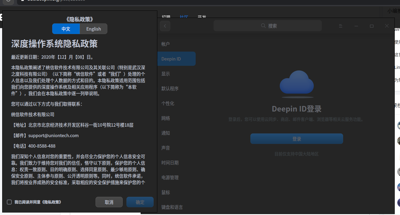 点开Deepin登录直接跳转到《隐私政策》,勾选确定之后没有任何响应