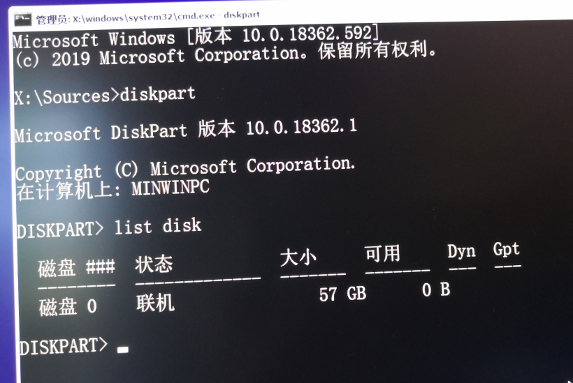 2.1/尝试在安装界面使用diskpart命令,但list disk只显示U盘启动盘,不显示我的硬盘