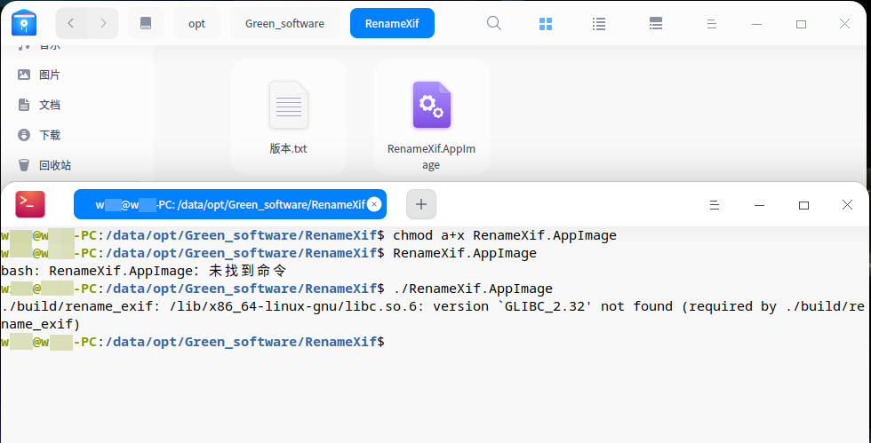 需要添加可执行权限。你到命令行模式, 直接chmod a+x renamexifxxxxx.appimage ,然后 ./reanmeexifxxxxxx.appimage 执行, 这么执行。